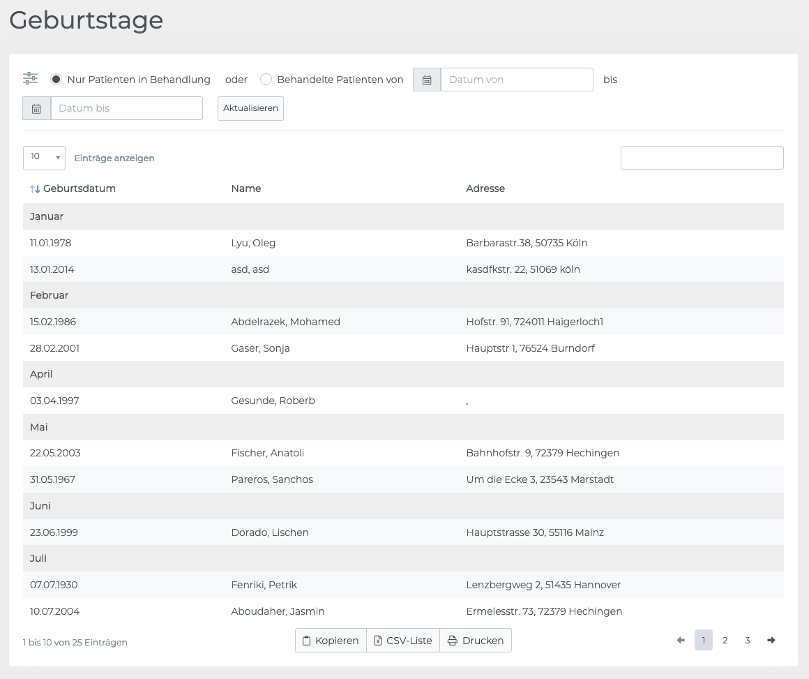 In dieser Liste sehen Sie alle Patienten sortiert nach Ihrem Geburtstag gruppiert nach dem Monat.