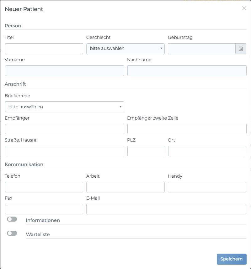 Im Bereich „Informationen“ können Sie zusätzliche Informationen zum patineten erfassen. Geben Sie unter „Zusatzinformationen“ weitere Daten, die Sie bei der Aufnahme eines Patienten festhalten wollen, z.B. Diagnosen, Terminwünsche.